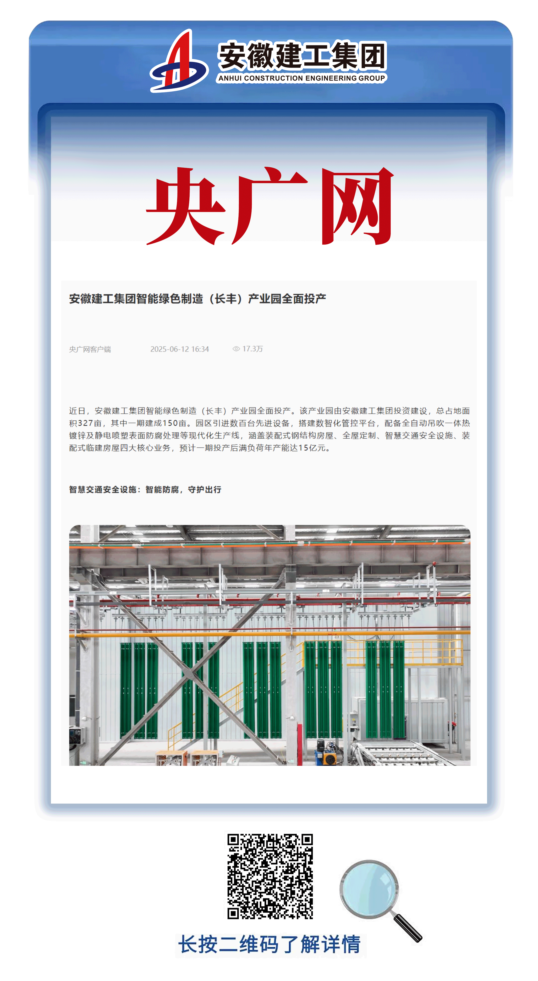 近日,安徽建工集團(tuán)智能綠色制造(長豐)產(chǎn)業(yè)園正式開園并全面投產(chǎn),這一轉(zhuǎn)型發(fā)展成果引發(fā)人民網(wǎng)、央廣網(wǎng)、安徽日報等多家主流媒體的廣泛關(guān)注與深度報道。各大媒體從產(chǎn)業(yè)創(chuàng)新、技術(shù)突破、綠色發(fā)展等多個維度,對產(chǎn)業(yè)園進(jìn)行了全方位解讀,展現(xiàn)了安徽建工集團(tuán)在智能制造領(lǐng)域的突出發(fā)展成就。