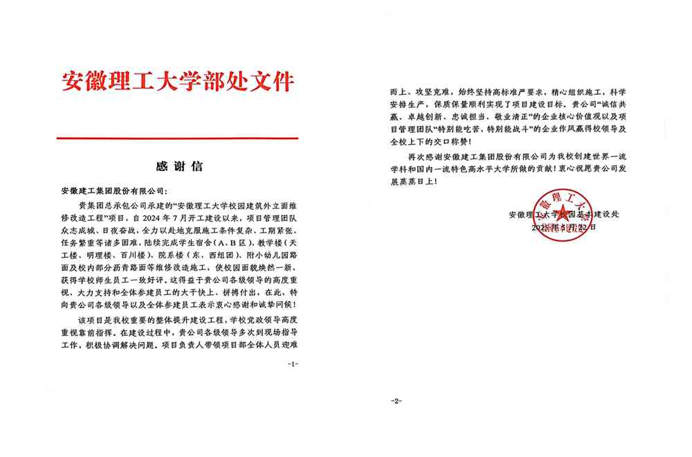 近日,安徽理工大學給安徽建工集團發來感謝信。信中對建工總承包公司精心組織施工、科學安排生產、高標準高質量完成安徽理工大學校園建筑外立面維修改造工程項目給予好評,對安徽建工集團助力其創建世界一流學科和國內一流特色高水平大學表示感謝。