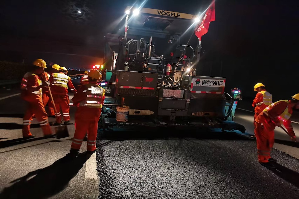 面對工期緊、任務重的雙重考驗,建工建材公司科學統籌,創新采用“雙站點并行供料”模式,同步啟動兩大瀝青生產基地,實現24小時不間斷供應。施工現場劃分為四個作業班組,以“同步推進、交叉作業”戰術高效協同,嚴把質量安全關,確保工程進度與品質雙達標。