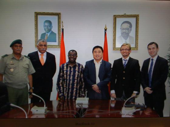 11月21日,中國駐安哥拉大使張伯倫先生設宴宴請了考察團一行。胡董事長一行還分別與在安哥拉合作的三家公司進行了業(yè)務洽談,并先后與JHS公司以及Solida投資公司簽訂了3900萬美元的承包工程合同