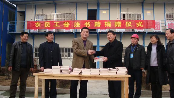 2010年元月28日下午,合肥市人民檢察院向安徽建工農民工業余學校捐贈農民工普法書籍儀式在安徽三建美亞光電項目部舉行。市檢察院黨組成員、副檢察長黃世斌,黨組成員、政治部主任童興芝等一行四人,看望慰問農民工兄弟,宣傳農民工法律維權知識,并現場捐贈《農民工普法讀本》200本。集團公司副總經理、集團農民工業余學校常務副校長王禮義,集團人力資源部主任胡建英,安徽三建紀委書記周湃等出席捐贈儀式。