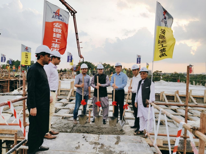 On September 29, ACEG Pakistan Branch, Project Afghan Embassy in Pakistan held a ceremony to celebrate the completion of the structures of the diplomat apartment building, H.E. Mr. Shukrullah Atif Mashal, Afghani Ambassador to Pakistan; the Supervision Engineer; Mr. Chen Shen, the Chief Engineer of ACEG Overseas Company; Mr. Hu Haitao, General Manager of ACEG Pakistan Branch and the Project workers'' representatives attended the ceremony.